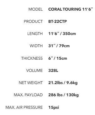 Constructed of Drop Stitch Light Technology, the 11’6” CORAL TOURING only weighs 9.6kg while allowing up to 130kg to be loaded up. The newly designed backpack makes the board convenient for travel and transport, and it neatly packs away all the specific accessories until the next wondrous destination.