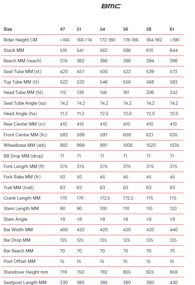 Handlebar reach/drop: 77/117 mm (RCB01), 70/125 mm (RAB02 and RAB03)