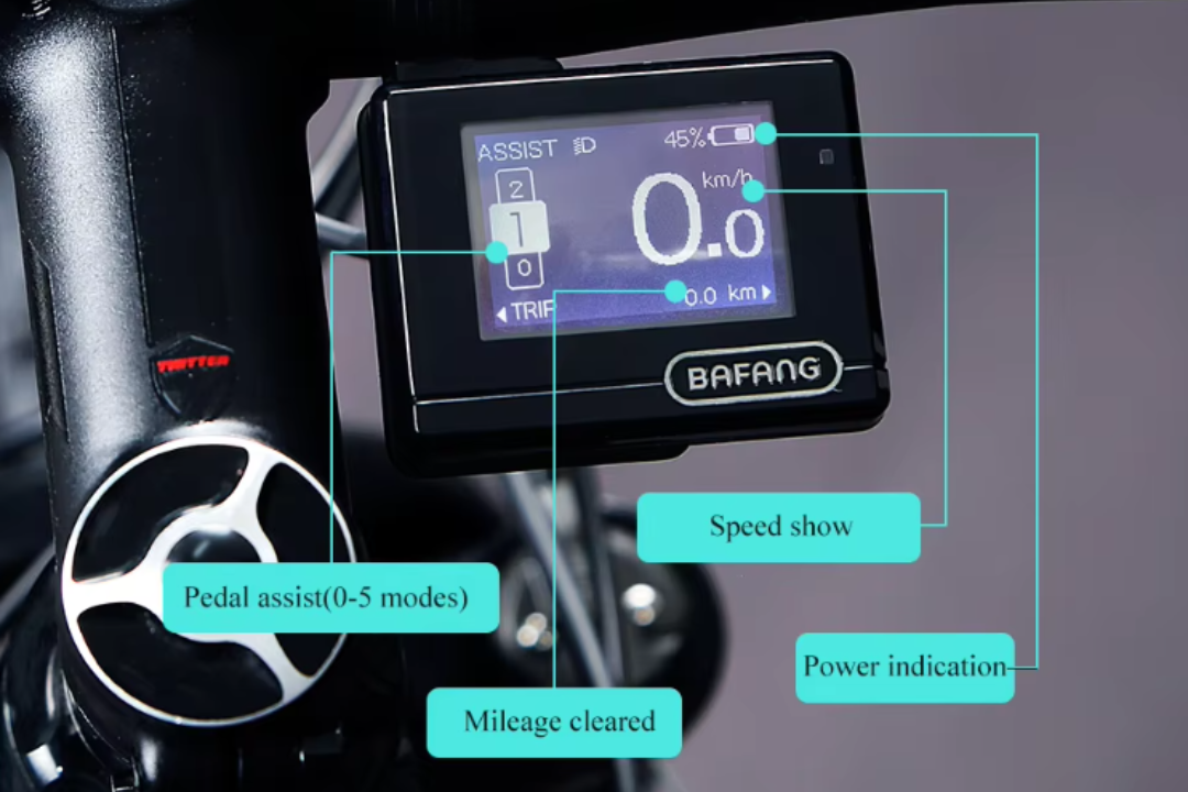 - HMI Display: Bafang LCD digital display with 0–5 power modes for real-time monitoring of performance and battery life.