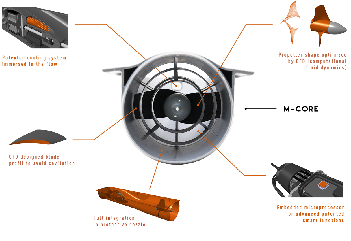 Propulsion : Propeller : PA with 30% fiberglass, Tuyere : PP with 20% fiberglass, motor shaft : stainless steel, screws : stainless steel (AISI 316). Brushless electric motor with neodymium magnets.