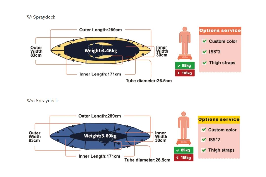 Models are available with and without the spraydeck. The multi-function D-type sprayskirt has a detachable zipper and Velcro which allows easy spraydeck closure when the temperature drops.