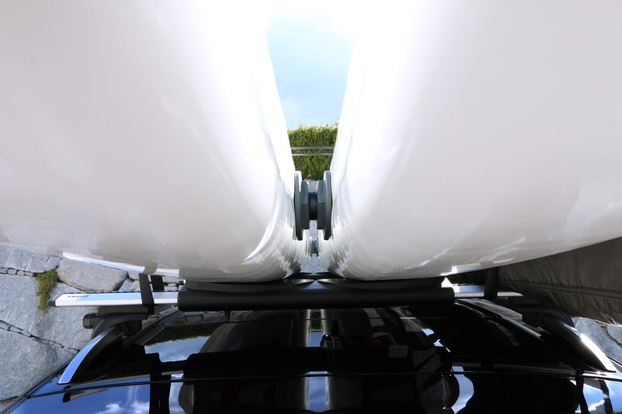 but does include 2 straps to strap down the hulls, 2 straps to strap down the mast and main trampoline, 2 PUR hull cushions that specifically for Thule Wingbar, and the most important part of this kit – the peg! The peg inserts into the hole vacated by the crossbars, this keeps the hulls aligned to each other when on the roof of a car, keeping them from rotating and becoming the-guy-behind-you-on-the-highway's XCAT!